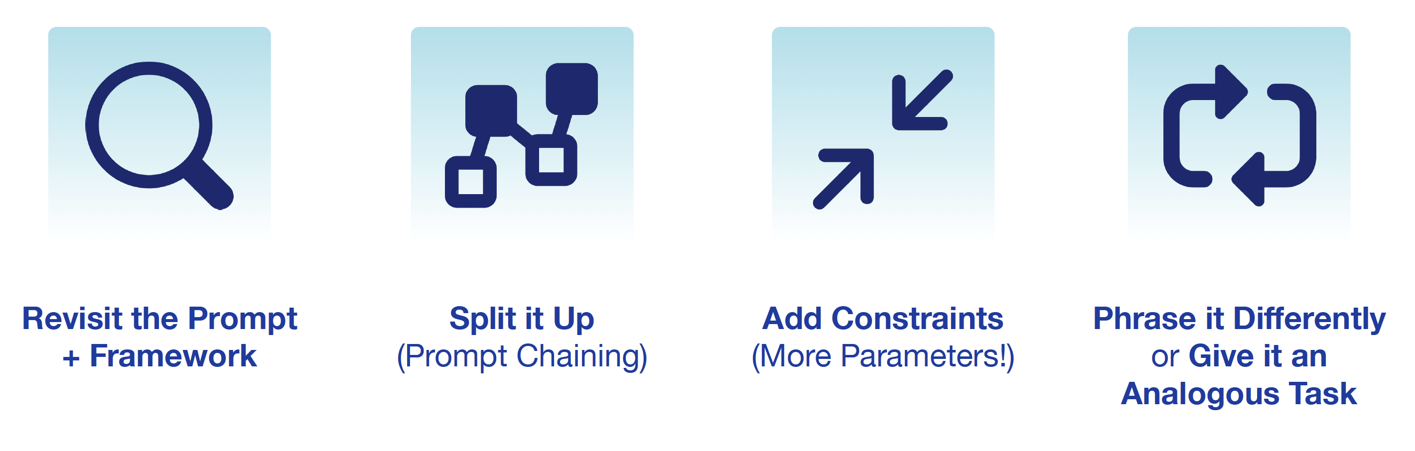 - Iterate in 4 Steps: Revisit → Split it Up→ Add Constraints → Rephrase.