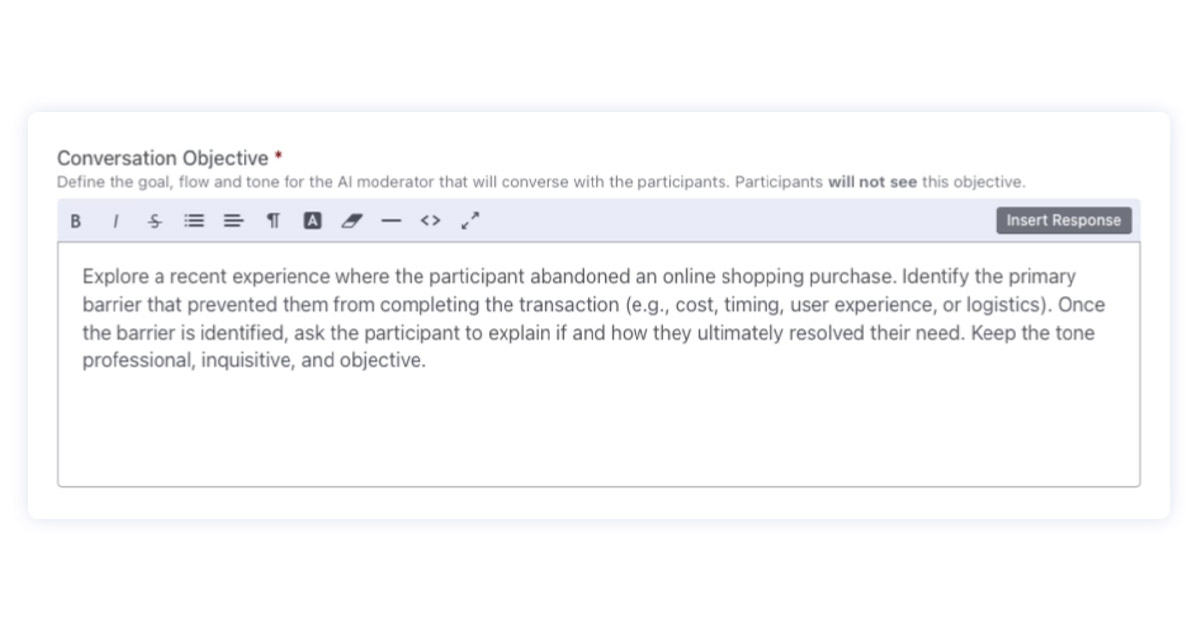 The objective is the anchor. It tells the moderator what “complete” looks like. This is especially useful for research prompts that commonly lead to partial answers, like multi-part questions, decision journeys and behaviour plus motivation prompts.