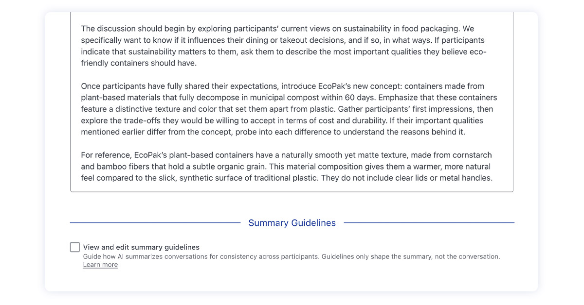 When you run a Conversation Task in Recollective, you already get AI-generated summaries built around your research objective — rich, fast and ready for review. Conversation Summary Guidelines take that foundation a step further. As studies scale, the ability to define exactly how summaries are structured becomes a real advantage. Instead of reviewing outputs that vary in format from one participant to the next, you set a consistent framework up front — so every summary follows the same structure, making it faster to compare findings, easier to spot themes and more natural to move from synthesis to reporting.