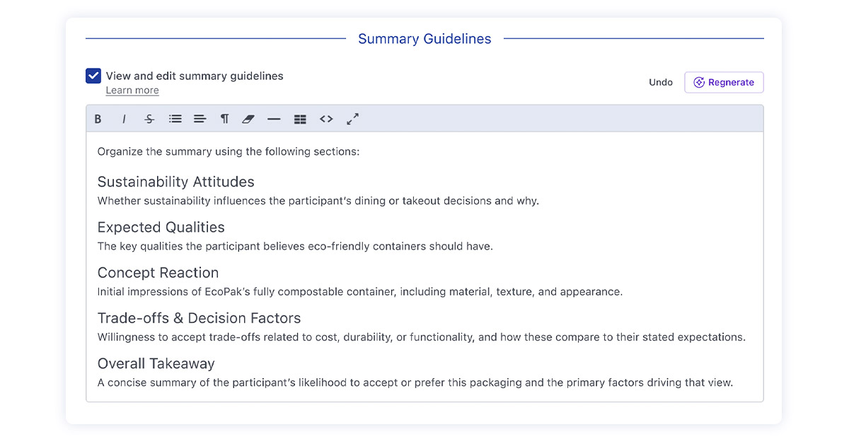 Once the task is live, the same guidelines are applied to all participant summaries. The output is uniform, comparable and aligned to your research goals. This makes cross-participant analysis dramatically faster and more reliable.