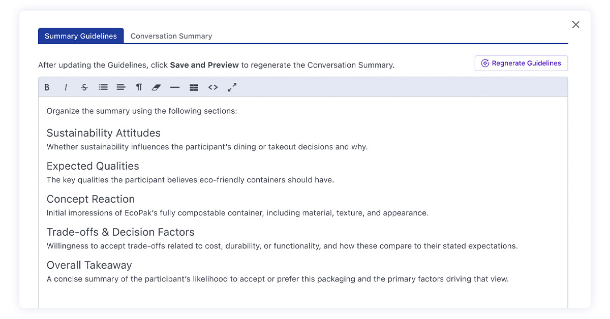 During setup, Recollective uses your Conversation Objective to automatically generate Summary Guidelines—a clear set of headers and prompts that guide how the AI summarizes each completed conversation. The result? Summaries that stay focused on what you actually need to learn, not whatever the AI decides is interesting.