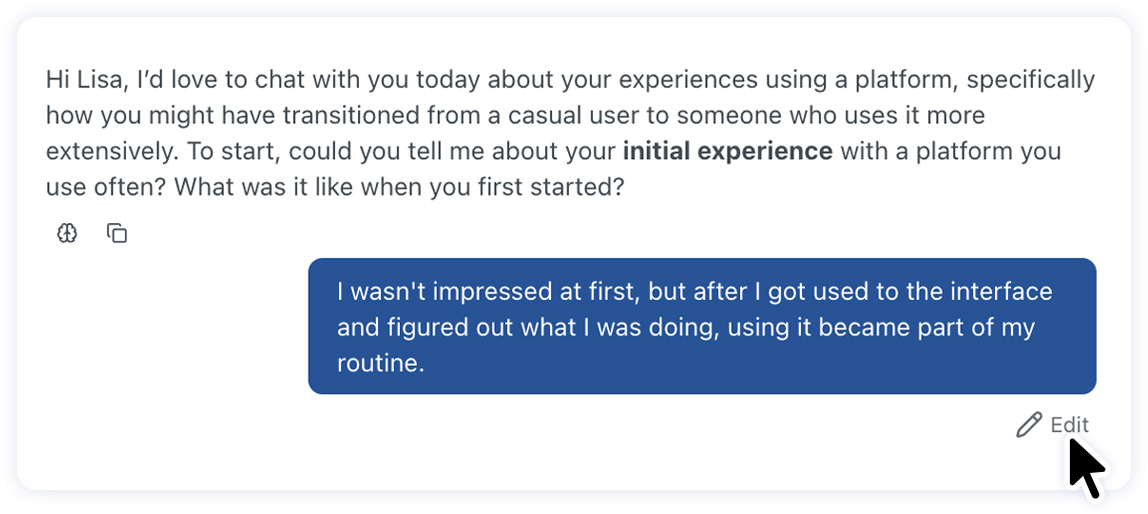 Then they realise what they meant was: “This feels premium but the benefit is confusing” so they edit their last post. With this latest release, the AI moderator will update its next reply based on the edit and probe benefit clarity, not general confusion. That keeps the conversation accurate and the insight more actionable.