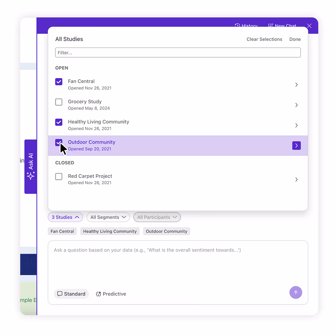 Use Standard Mode to synthesize what participants said, Predictive Mode to explore likely reactions. Add MultiProject Mode to connect insights across projects.