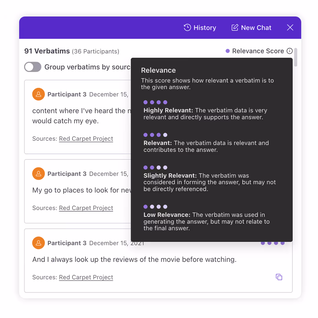 Every answer includes source verbatims with a relevancy score, so you can validate quickly and lift ready-to-use excerpts for reporting.